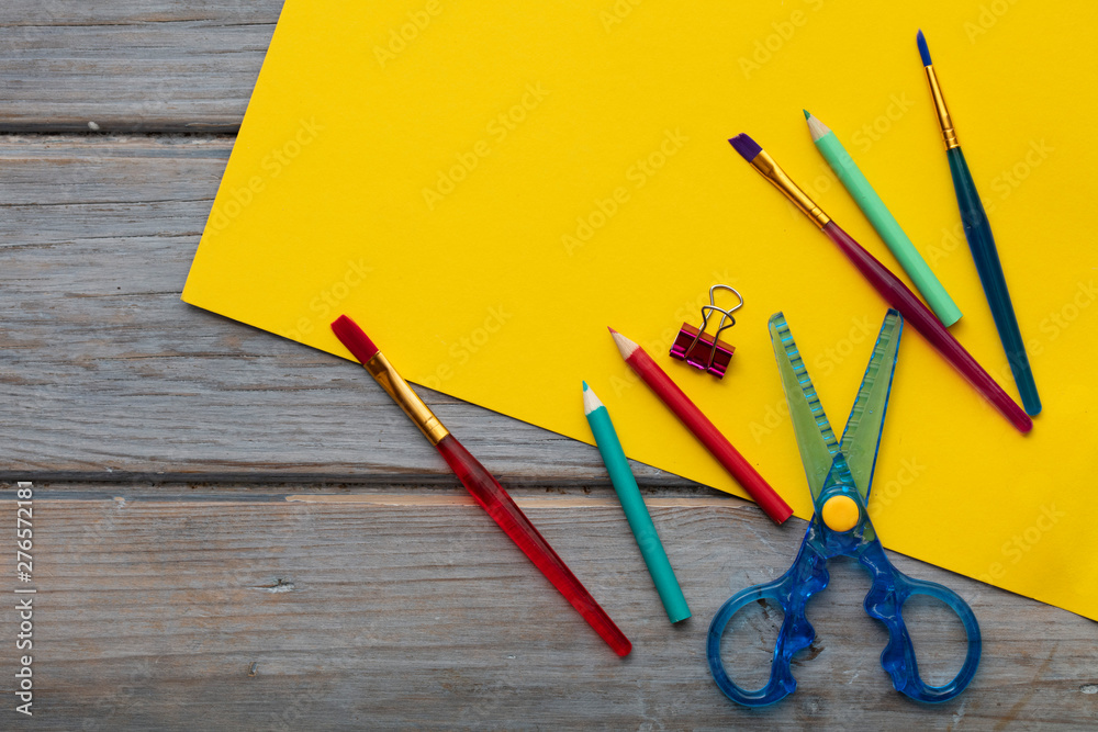 Childrens art and craft composition. Art supplies and yellow paper on a desk