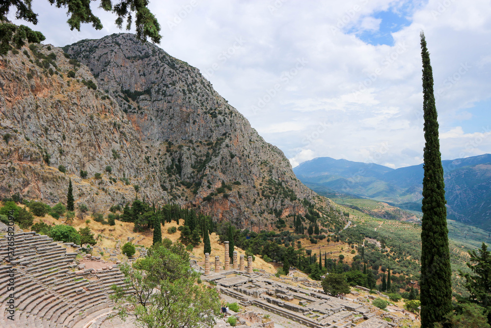 Panoramic view to ruins of ancient theatre and temple of apollo in Delphi, Greece
