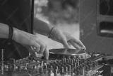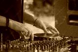 Dj playing disco house progressive electro music at the concert. DJ hands on equipment