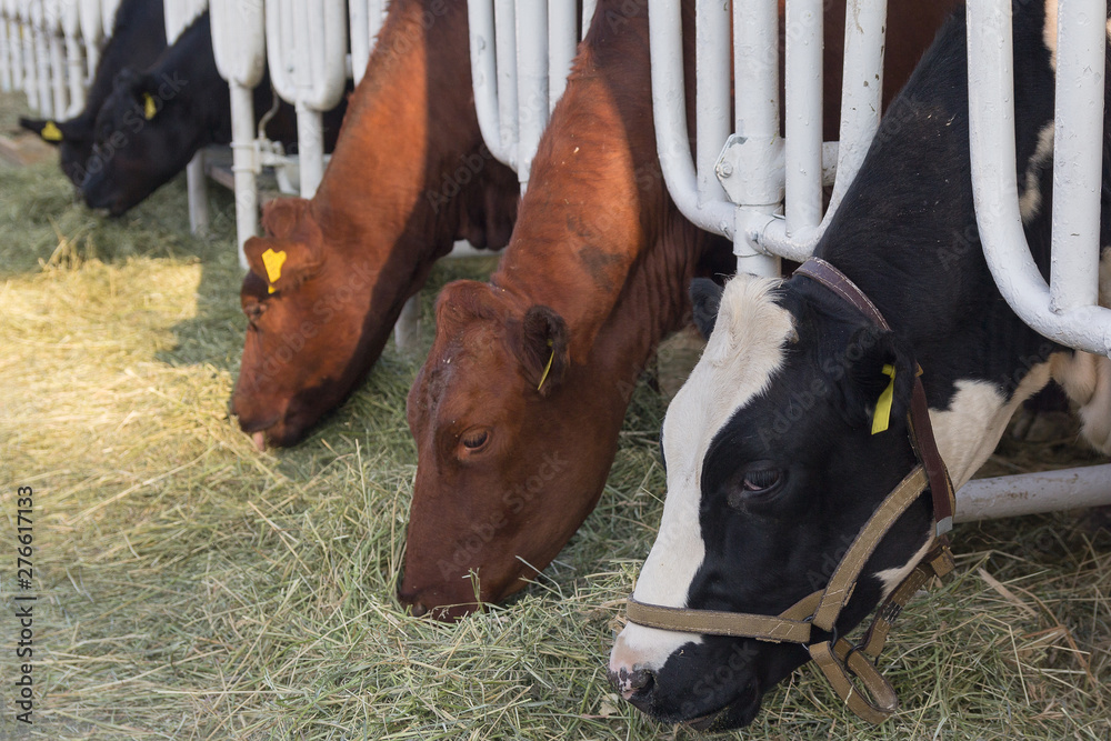 Cows eating lucerne hay from manger on farm. Agriculture