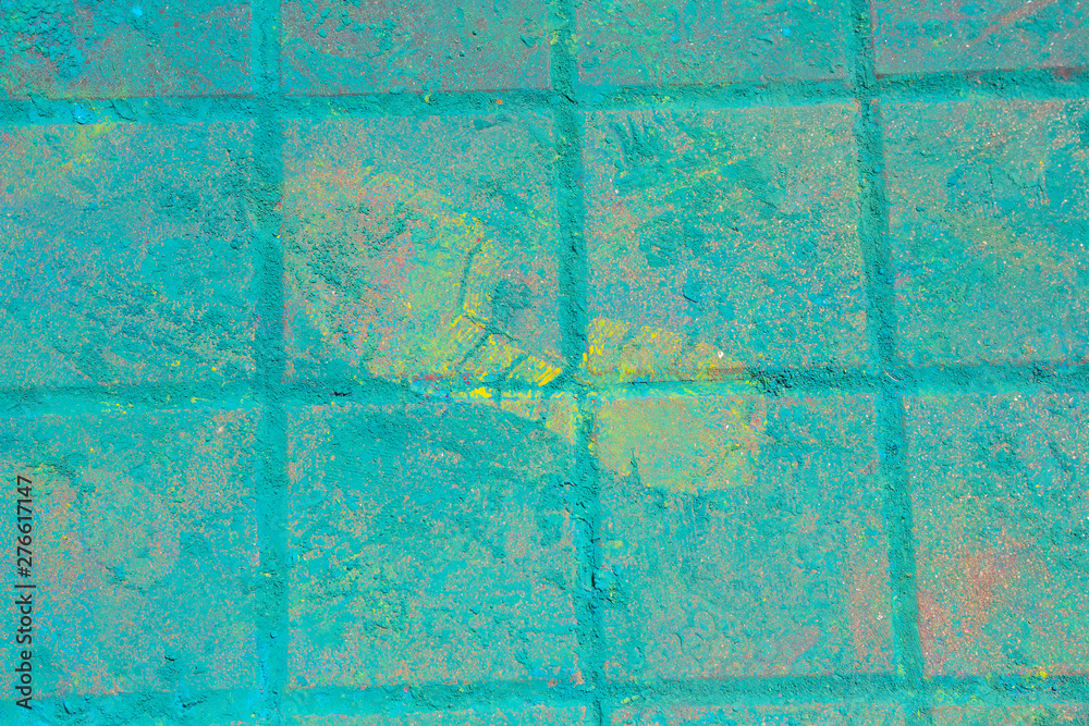 Trace of feet on the paving tiles covered with multi-colored paint. Holi Festival