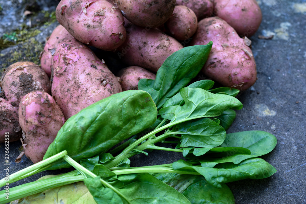 Fresh organic home grown vegetables. Produce harvested from vegetable patch, potatoes and spinach