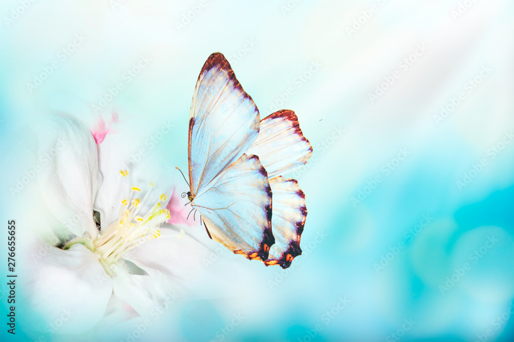 Beautiful spring background with butterfly and flower. Space for text. Spring summer border template floral background.