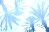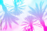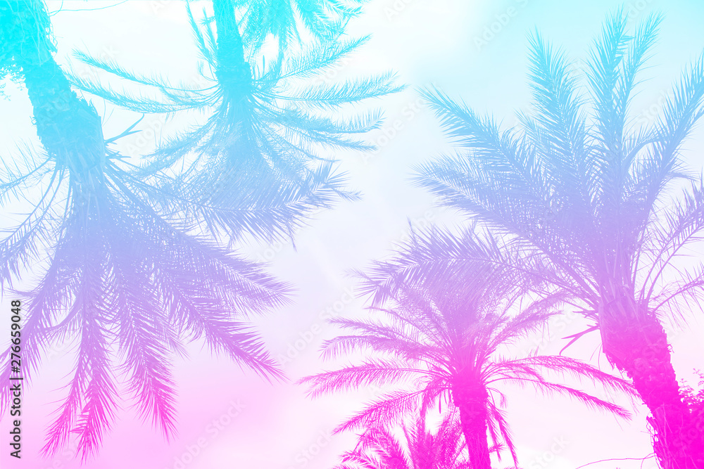 Silhouette of palm trees with a bright summer gradient on a bright blue background of the summer sky. Mirror reflection. Concept tropic, vacation and travel. Abstraction