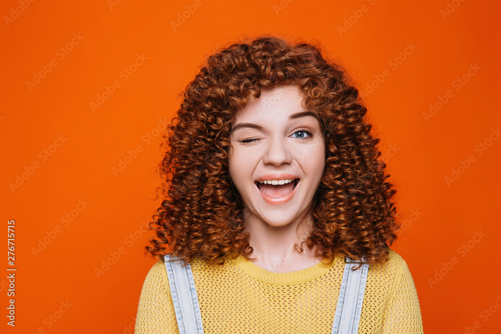 Curly- haired funny teenage girl winks with an eye opening her mouth in amazement against an orange background