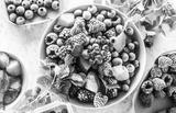 Frozen fruits blueberries blackberry raspberry red currant peach and herbs melissa