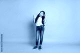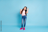 Full length body size view photo content cute kid lucky scream yeah goals fan free time weekend relax rest raise fists ecstatic reaction funky jeans clothes fuchsia shoes isolated blue background