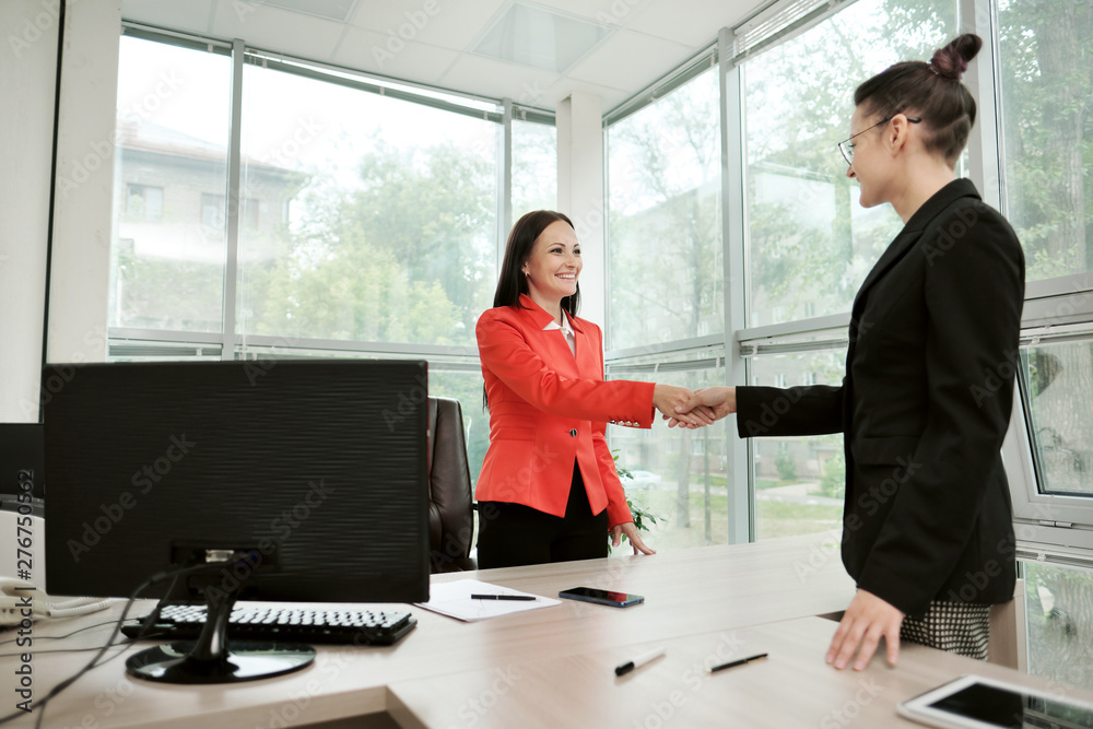 Two beautiful young women in business suits shake hands and smile. Hiring a job. Signing the agreement. Women at work.