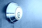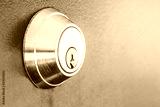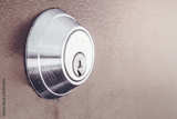 Modern new metallic grey shiny keyhole on door background. Side view of keyway with sun light and copyspace.