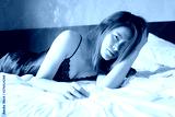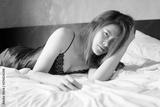 Portrait of a charming sexy Asian woman in black lingerie lying on the bed and looking at camera.