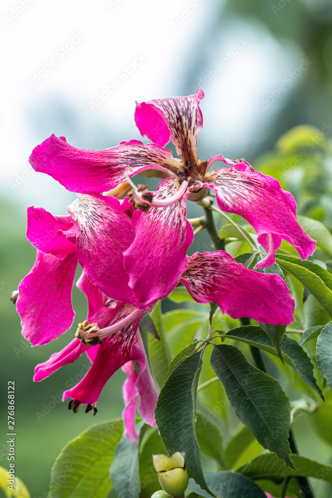 Silk floss tree (Ceiba speciosa) blooming in a garden.