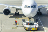 Aircraft is taxiing to the parking place. Pushback tractor is towing the aircraft to a parking lot. Aviation Supervisor.