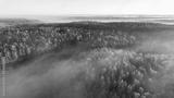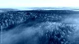 Thick glowing fog among spruce forest down in the valley. Wonderful nature background. Aerial viewpoint. Beautiful Finnish nature.