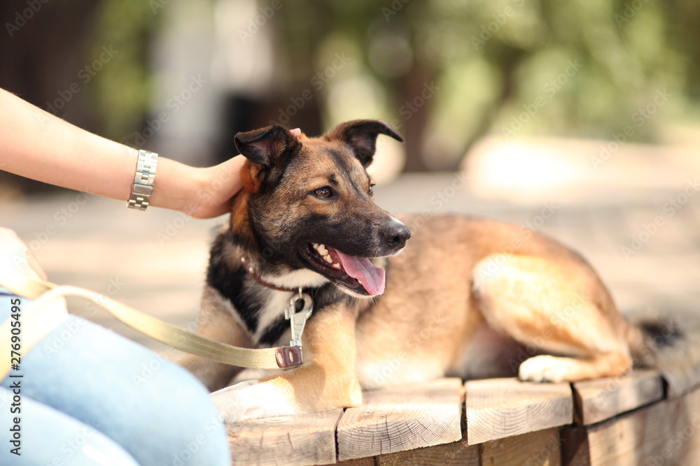 Kind and playful puppy, cute dog. Choosing family friend in shelter for homeless animals.