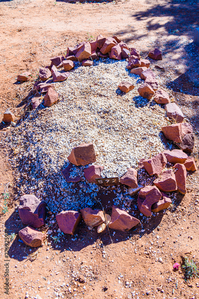 Unmarked grave marked only with a surround of broken bricks and stones.
