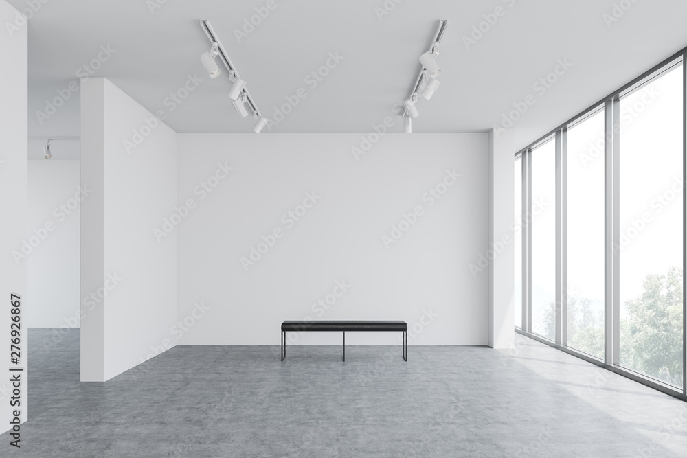 Empty white gallery interior with bench