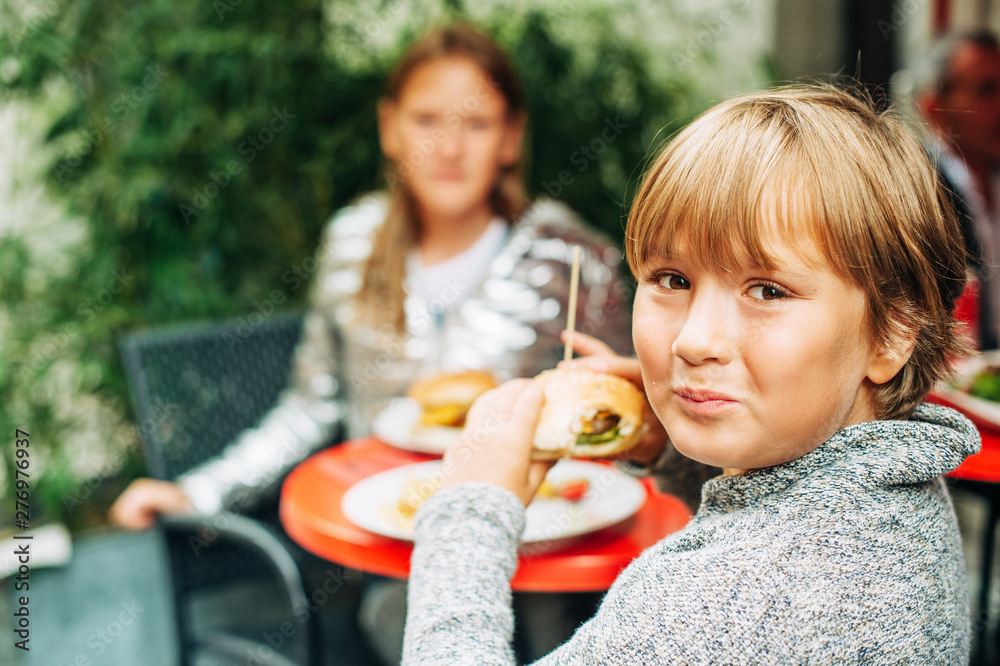 Family having lunch outside on a terrace, background with meal, children eating humburgers