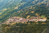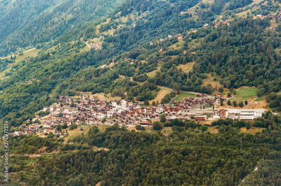 Summer landscape with many chalet houses in swiss Alps, canton of Valais, Switzerland