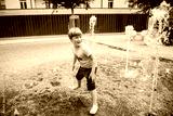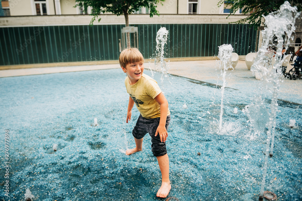 Funny kid boy playing with small fountains on playiground on a very hot summer day