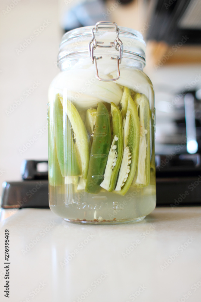 Jalapeno peppers and onion preserved in a pickling jar.
