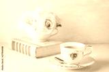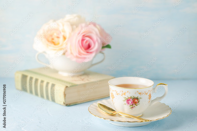 Close up of cup of tea with flowers and book on blue background with vintage tone