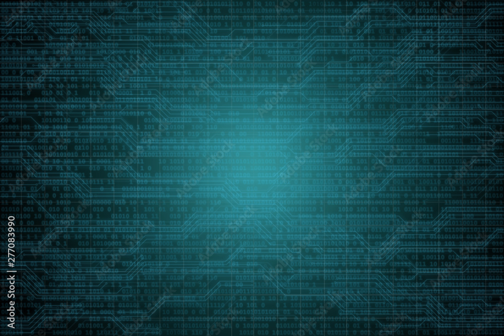 Computer hacker in mask and hoodie over abstract binary background. Obscured dark face. Data thief, internet fraud, darknet and cyber security.