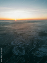 Dawn over the frozen river, fog between the trees, bundles of fog.