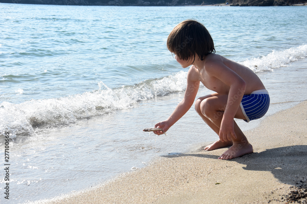 Boy play with a little fish on the beach. Child catch fish on the sea coast