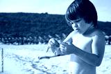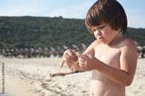 Boy play with a little fish on the beach. Child catch fish on the sea coast