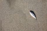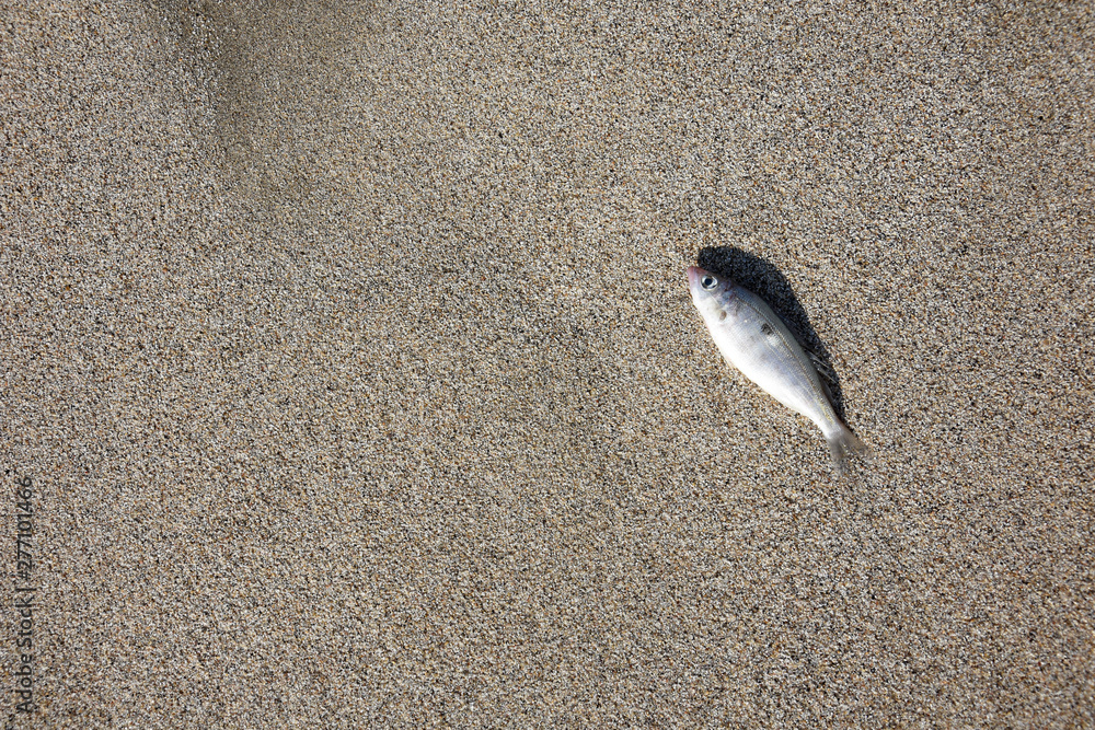 Little fish on sand at beach. Waves threw fish on the sea coast