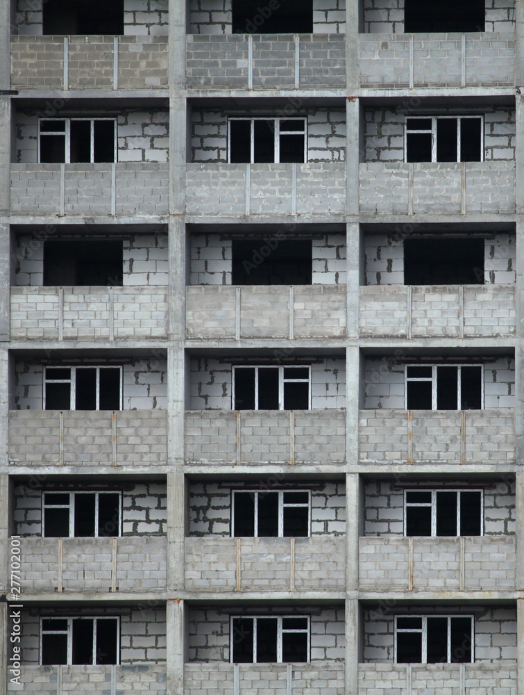 The fragment of the facade of unfinished and abandoned monolithic residential building. Background with windows of the multi-storey building. Verticale frame