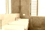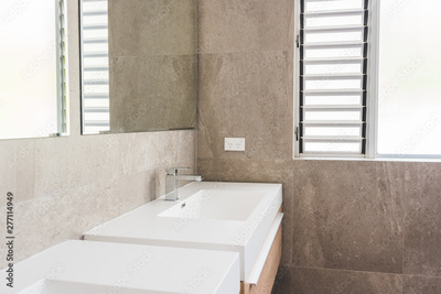 Closeup of white sink and metallic tap in contemporary bathroom with stone tiles and mirrors (selective focus)