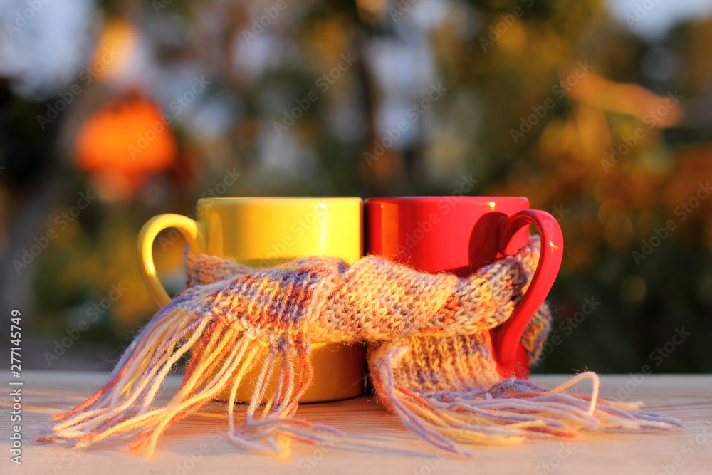 mugs together wrapped with a scarf on a table in the garden during sunset. warming drink for two