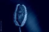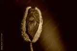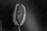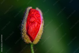 Knospe einer geschlossenen Mohnblüte vor dem Erblühen vor grünem Hintergrund