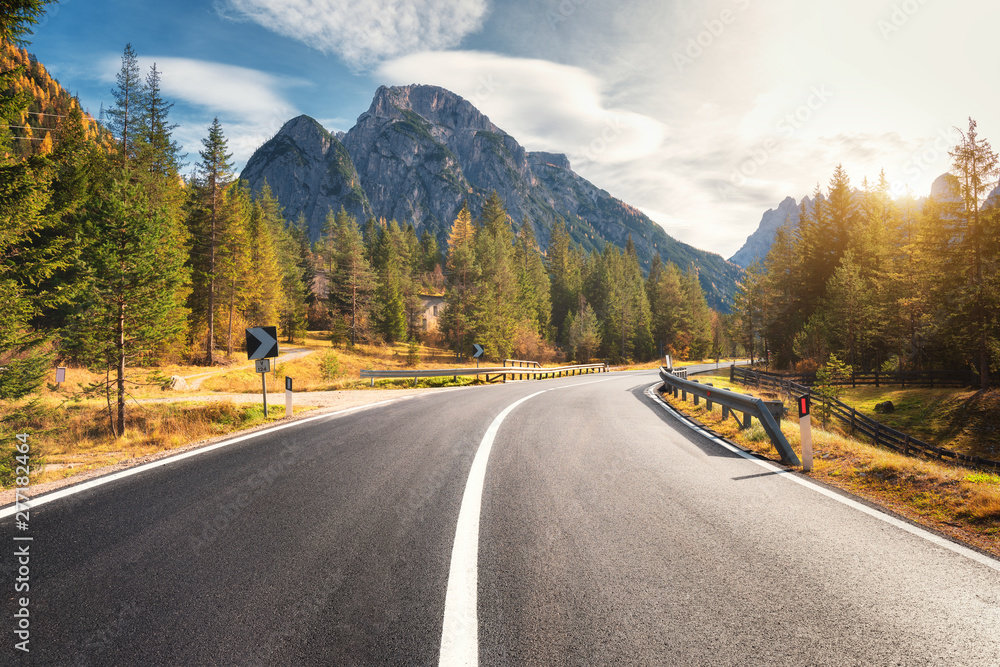 Road in summer forest at sunset in Italy. Beautiful mountain roadway, trees with green foliage and sunlight. Landscape with empty asphalt road through woodland, blue sky, high rocks. Travel in Europe