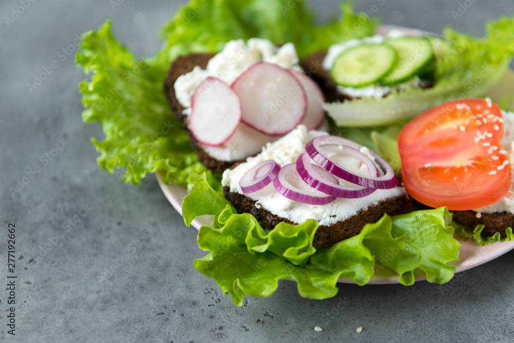 sandwiches with soft cheese, tomato, onion, radish, cucumbers on green salad leaves