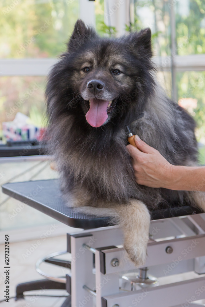 Vertically shot of trimming Wolf Spitz dog. The dog is lying on the adjustable hydraulic grooming table looking at the camera.