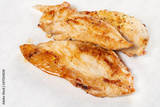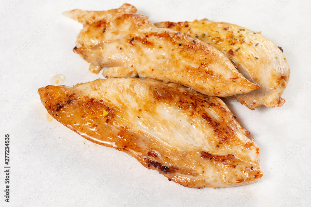 Fried chicken breasts isolated above white background.
