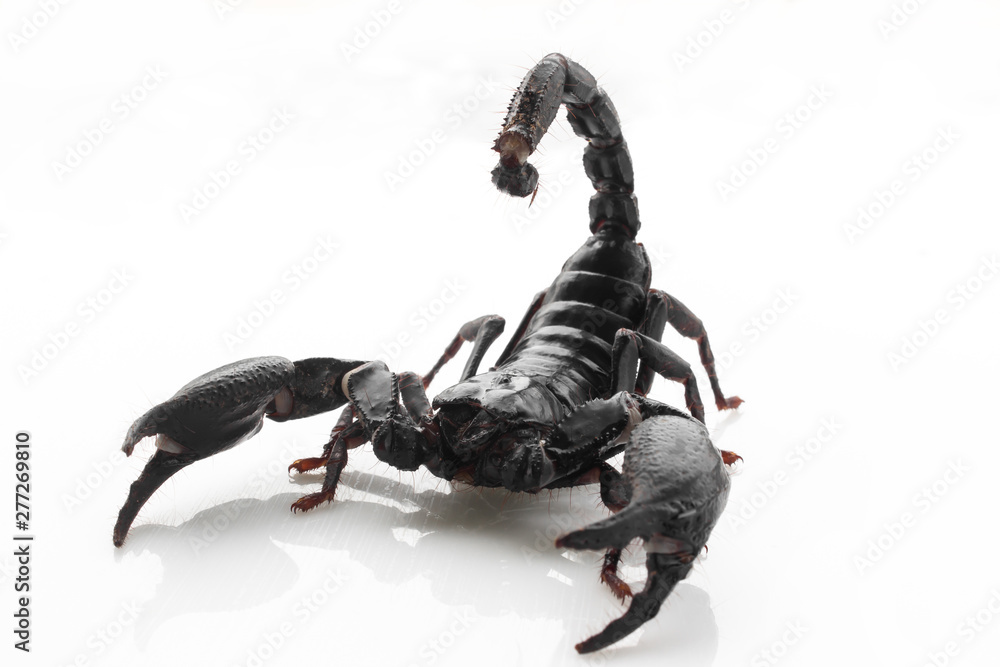 Scorpion on white background, poisonous sting at the end of its jointed tail, which it can hold curved over the back. Most kinds live in tropical and subtropical areas.