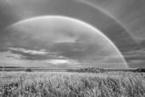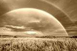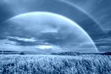 Rainbow over stormy sky. Rural landscape with rainbow over dark stormy sky in a countryside at summer day.