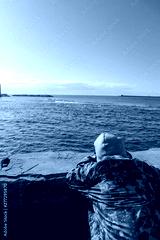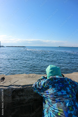 Young boy make a photo of the Mediterranean sea from Livorno seafront, Italy