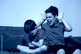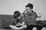 Angry boy offended not talking ignoring brother after fight, jealous kid brother avoiding boy after loosing video game, siblings bad relationships, two children conflict teasing and mocking a boy