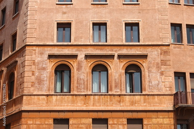 Traditional facade of European architecture with windows and blinds