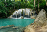 Clean green emerald water from the waterfall Surrounded by small trees - large trees, green colour, Erawan waterfall, Kanchanaburi province, Thailand