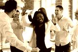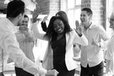 Happy funny black businesswoman with diverse team enjoy victory dance