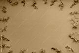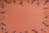 Flowers composition. Pattern made of wild small blue flowers on coral background.