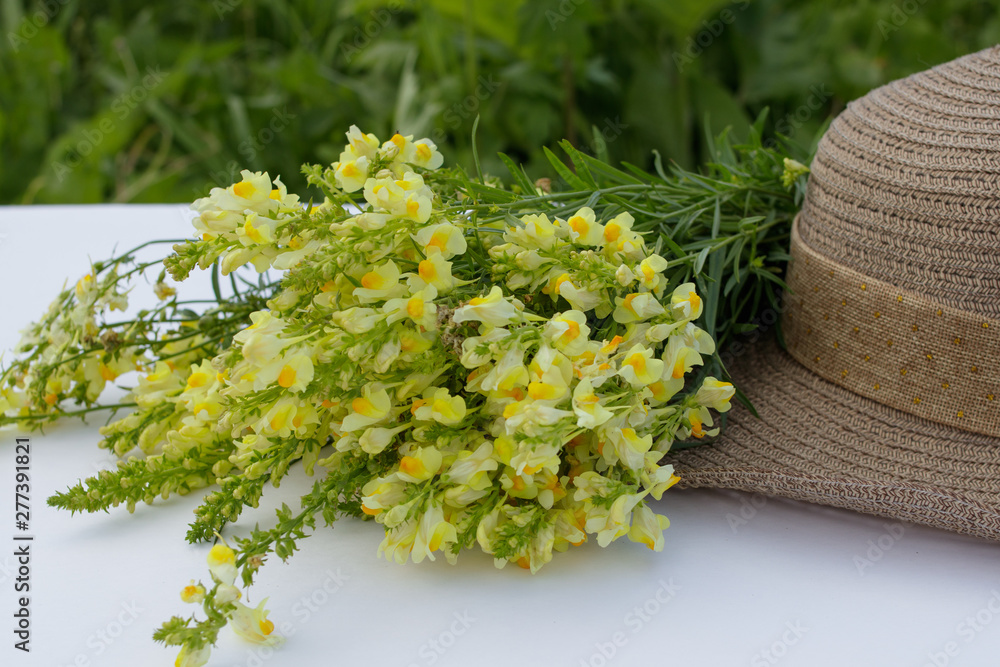 Summer composition. A bouquet of wild flowers snapdragon and women's sunhat.