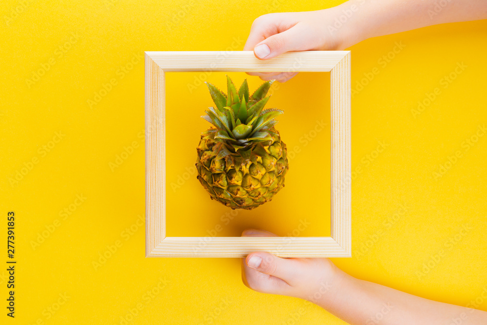 Hands of a child holding a wooden frame over baby pineapple on bright glowing summer yellow background. Exotic concept with copy space