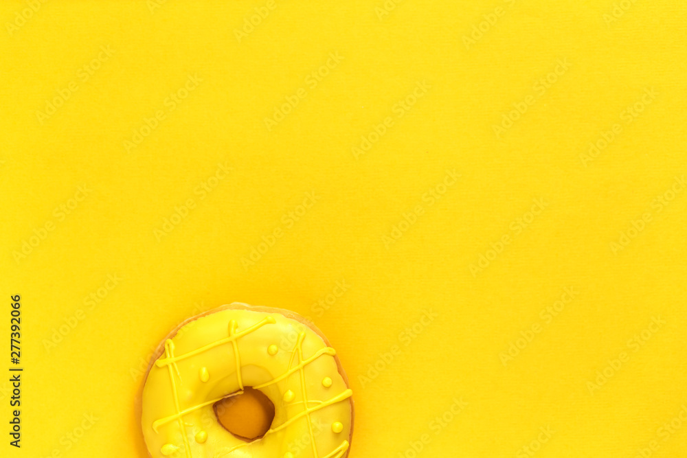 One tasty fresh Donut with yellow glaze on matching yellow background monochromatic. Top view flat lay with copy space