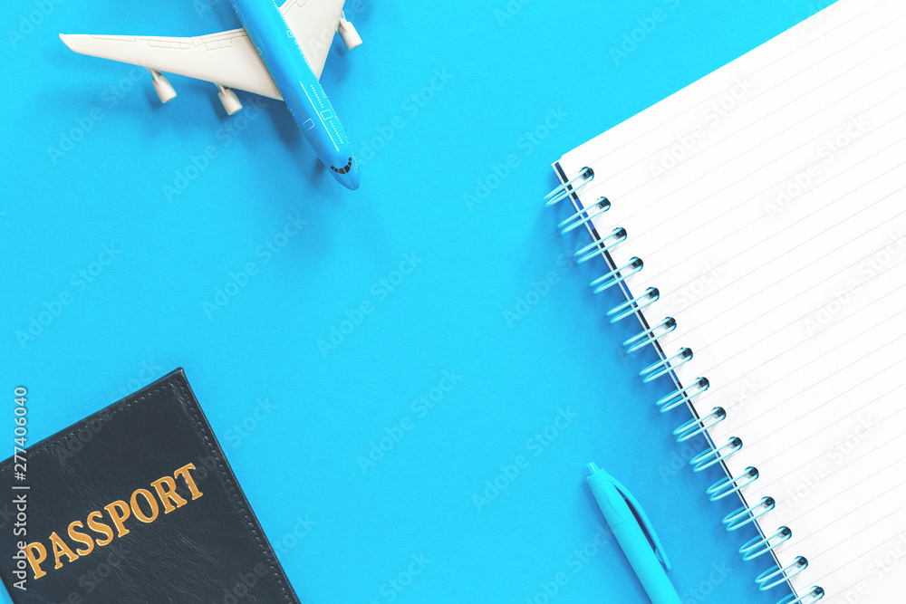 Blue toy airplane with a passport and open notepad on light blue background. Flat lay with copy space for air travel planning or ticket fare and visa or booking concept